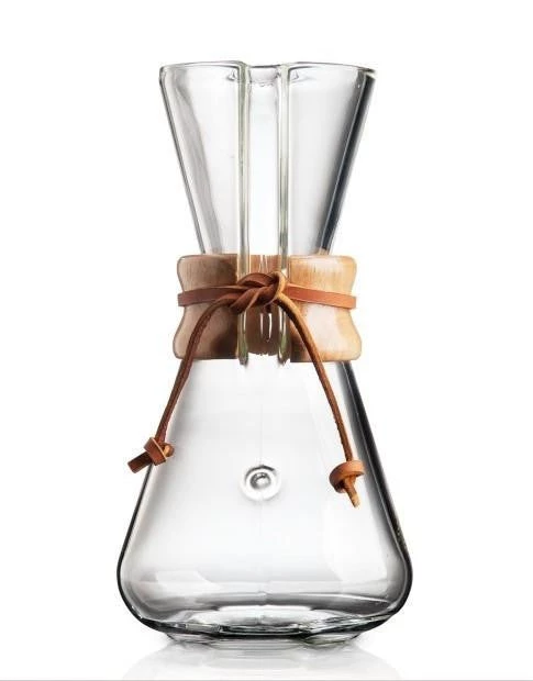 The Chemex coffee brewer produces a very clean, refreshing cup of coffee, due to the conical shape of the top of the brewer as well as thick, natural paper filters which fold to a point. The coffee brews in a thin stream from this single point, creating a clean solution that often highlights the fruity notes of exceptional fresh-roasted coffee.