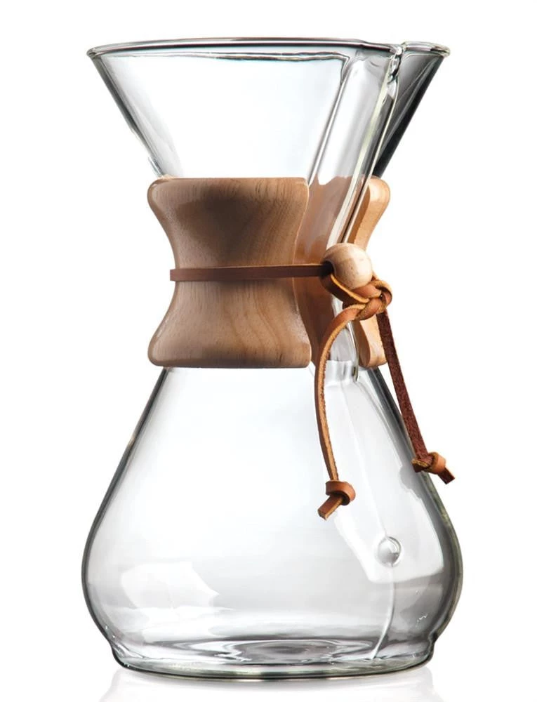 The brewer itself couldn’t be simpler. A glass carafe with a cone-shaped top and comfortable leather-tied wooden collar. Chemex’s elegant design has won it a permanent spot in the collections of the Museum of Modern Art, the Smithsonian and the Philadelphia Museum of Art. It makes it a beautiful serving vessel as well as a brilliant brewer.