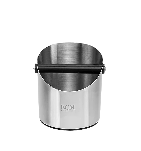 High-quality knockbox in brushed stainless steel for knocking out the used espresso pucks.