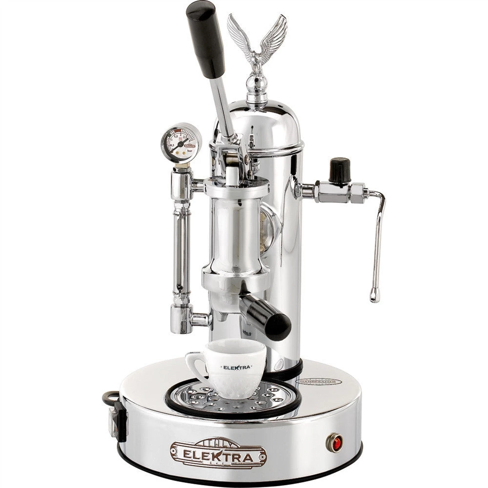 If you love great tasting espresso and enjoy being involved in the espresso making process, then the Elektra Micro Casa A Leva is the right machine for you. This exceptional espresso lever machine ensures you top notch performance every time you brew. It gives you precision pump pressure from the spring in the piston. You can access ample and powerful amounts of dry steam with one quick turn of the knob and the large1.8 litre brass boiler will quickly recharge steam. The machine is equipped with internal pressure regulator for automatic temperature regulation, water level sight glass to indicate level of water in boiler, boiler pressure relief valve and built-in thermostat to ensure the safety of machine. The dedicated retr style catches the attention and bestows elegance on the surroundings. And, Elektras performance in delivering quality espresso and cappuccino matches its beauty.