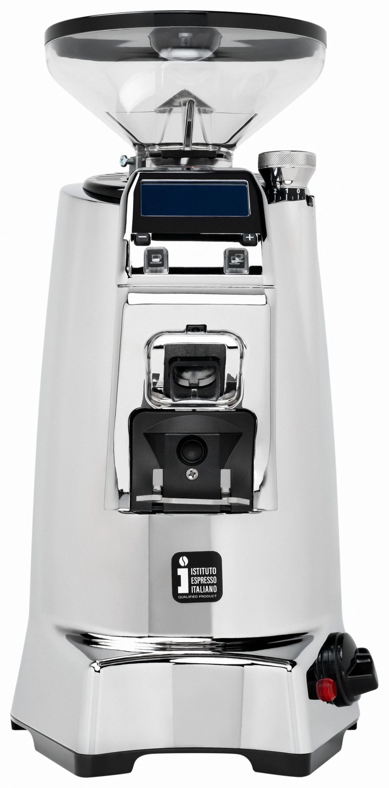 Grinder on-demand with stepless micrometrical grinding adjustment. Electronic control of the doses: Single and double dose, with independent adjustment, or continuous grinding. Digital dose counter with reset. Lock function. Courtesy lights above fork holder.