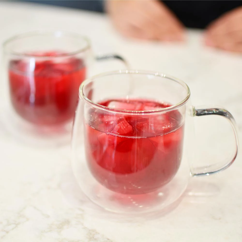 Double-walled borosilicate cups are a custom handmade type of glassware. Craft glass blowers make two mouth blown glass cups. Then they join them with heat to create the double walled glass cup. Each cup is literally made out of two handmade and mouth-blown glass cups. Your drink will appear to float in the air as its cradles in the inner glass, while the outer glass layer will show off your beverage and help to hold its temperature as well.