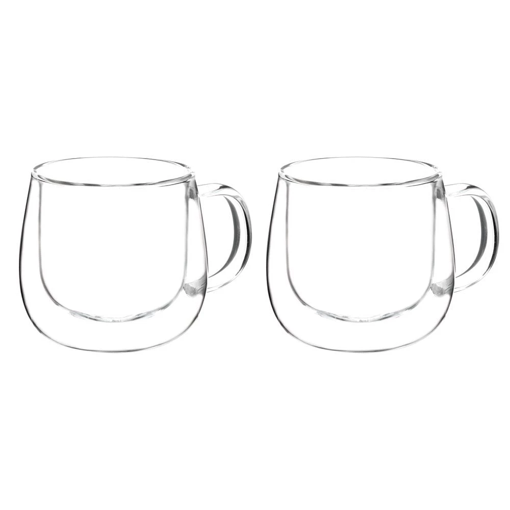 The FRESNO double walled glass cups are a classic design that is comfortable to hold and sip from. They are perfect for hot drinks like coffee or tea and also for cold drinks including alcoholic beverages. They come in a set of two and can hold 270 ml (9.2 fl oz). These cups have handles for a comfortable grip.