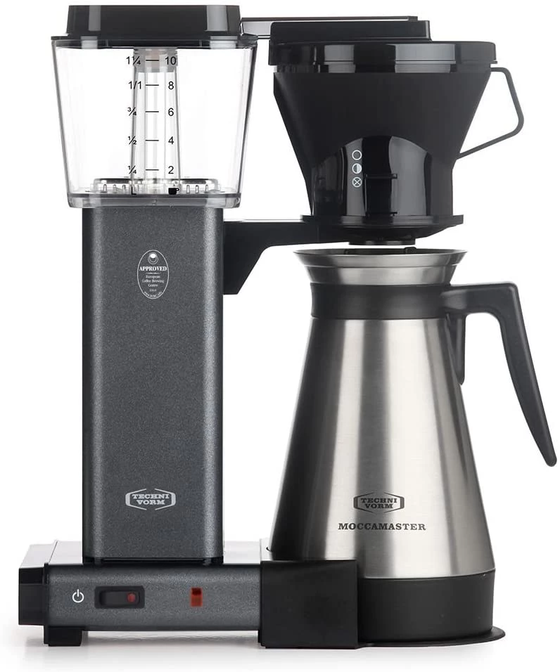 The Moccamaster KBT model features a thermal jug and a manual-adjust brew-basket which provides adjustability in how fast coffee flows into the jug. The KBT brews a full 10-cups pot of coffee in six minutes. The thermal jug will keep the coffee hot up to an hour. A travel lid is included to keep the coffee hot even longer.